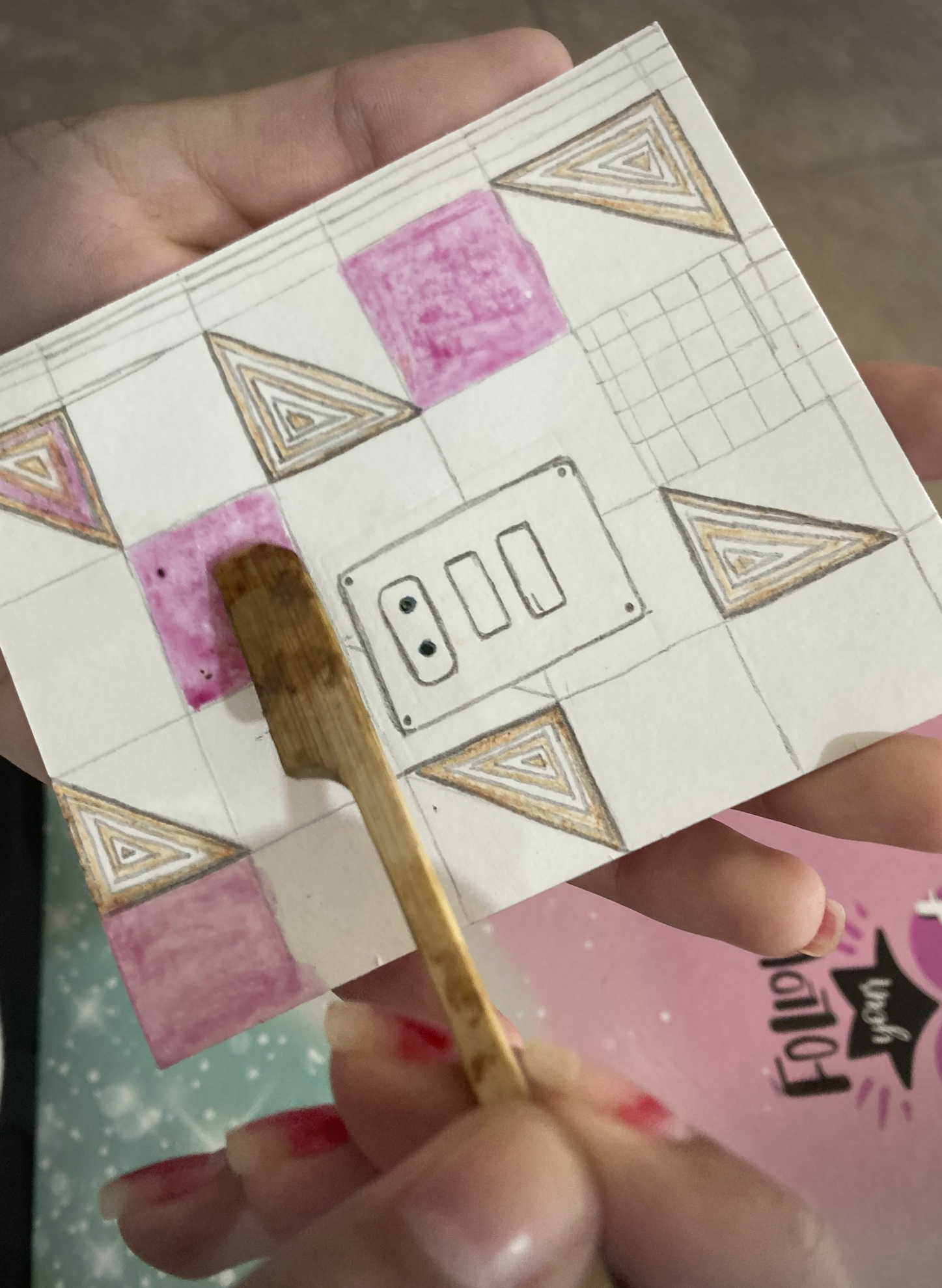 O cartão-olho, construído com um pedaço de papel cartão, com um orifício circular ao centro, é um dispositivo utilizado inicialmente na dinâmica “Olho no olho”, a linha do olhar e, em seguida, como peça de fixação e acoplamento da lente na câmera obscura.