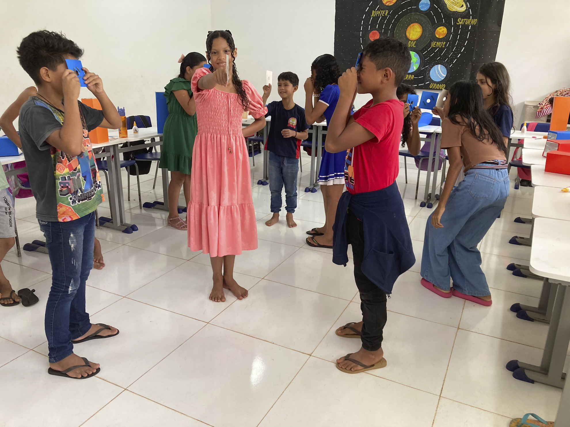 Esta dinâmica é realizada utilizando o cartão-olho e busca responder uma questão recorrente: por que a imagem visualizada na câmera obscura aparece invertida? Baseia-se no fato de que a trajetória dos raios luminosos, portadores do que constitui a imagem, é retilínea.